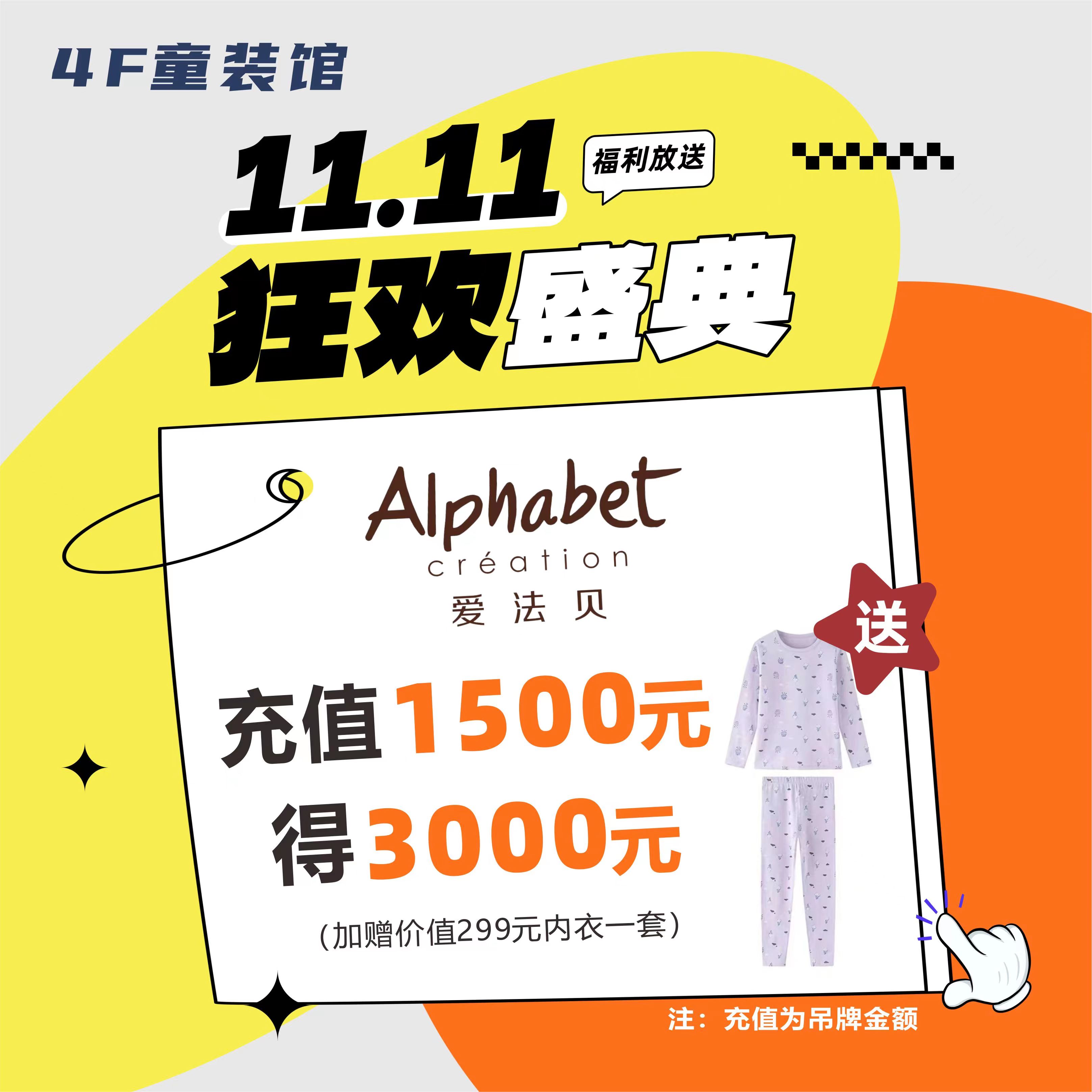 爱法贝充值1500元得3000元吊牌金额(加赠价值299元内衣一套)