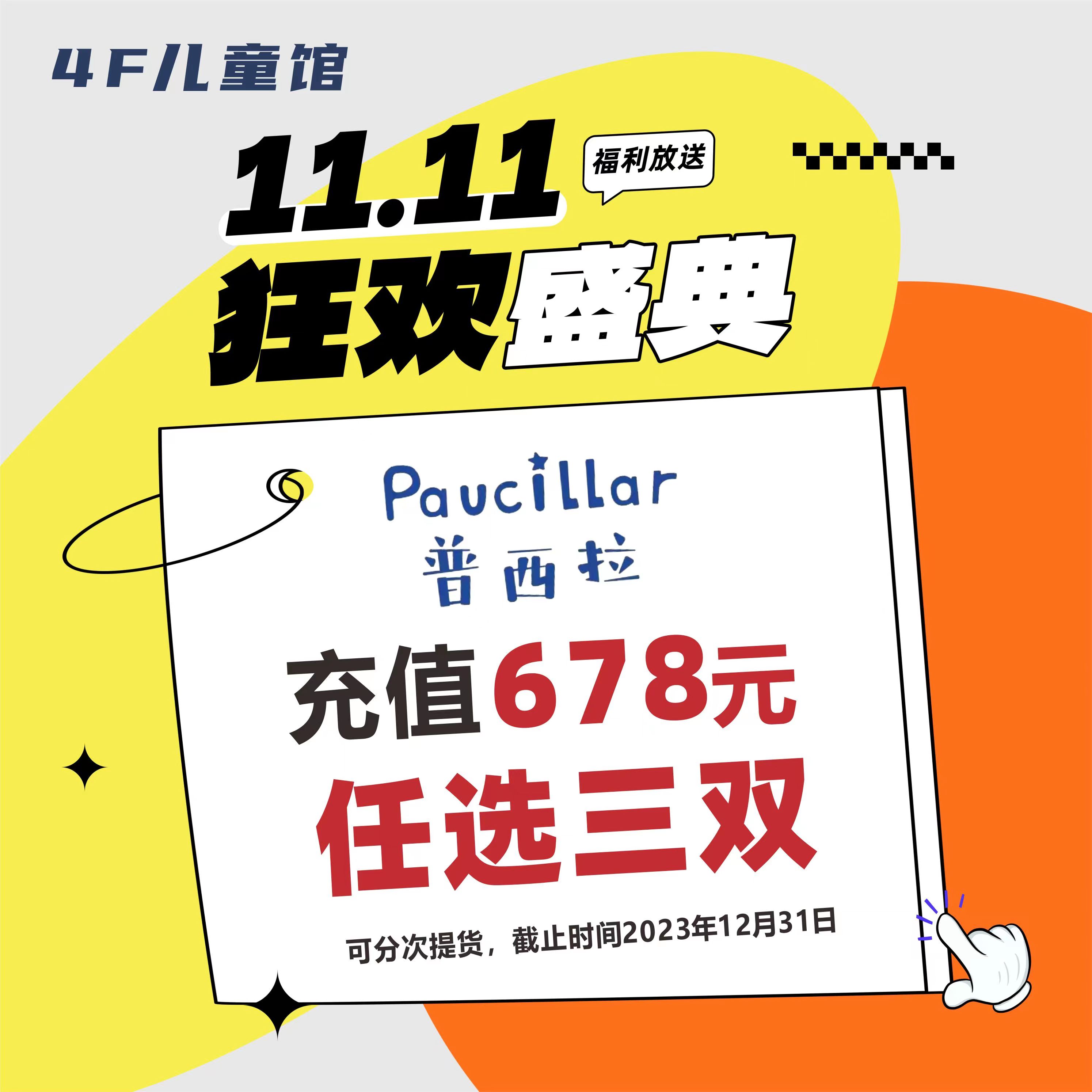 普西拉充值678元,全场任选三双,可分次提货,提货时间截止2023年12月31日。