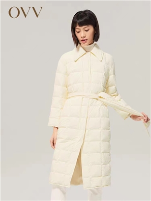 OVV秋冬女装翻领系带收腰长款直筒宽松90鹅绒羽绒服