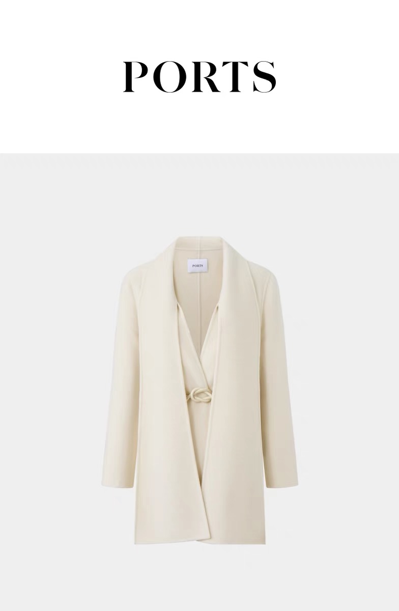 >>时尚设计感奶白色围巾领造型毛呢大衣