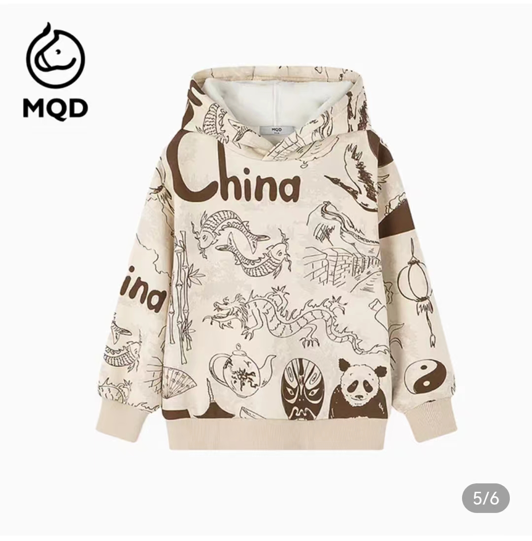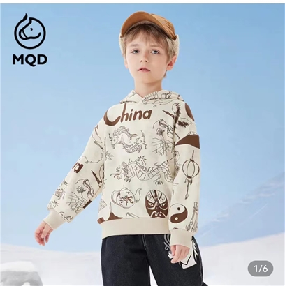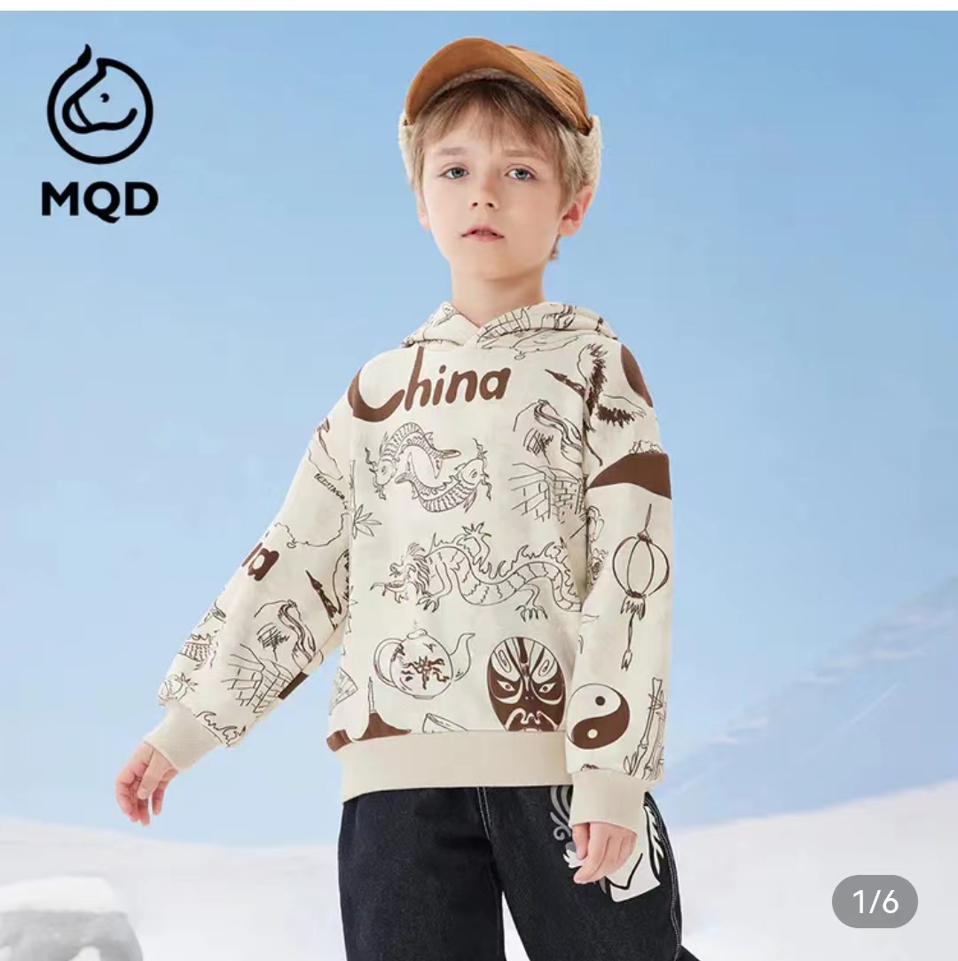 >>马骑顿MQD男童冬季国潮满版印花加绒连帽卫衣