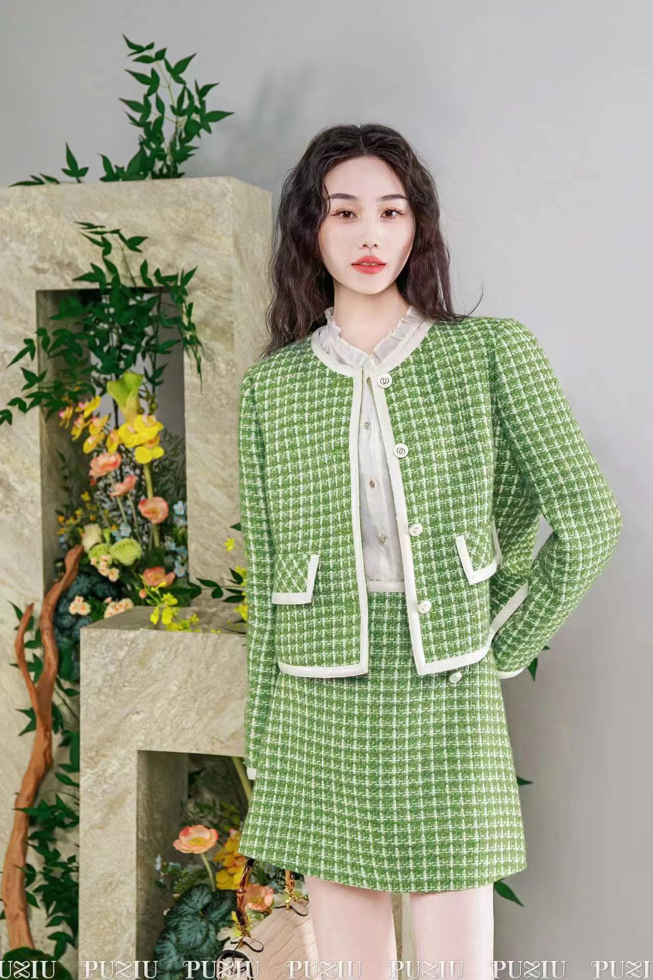 金典小香风套装,白色撞色边装饰,搭配挺括有型的小A裙,彰显穿搭品质,醒目的苔草绿色织格纹,新颖又时尚。