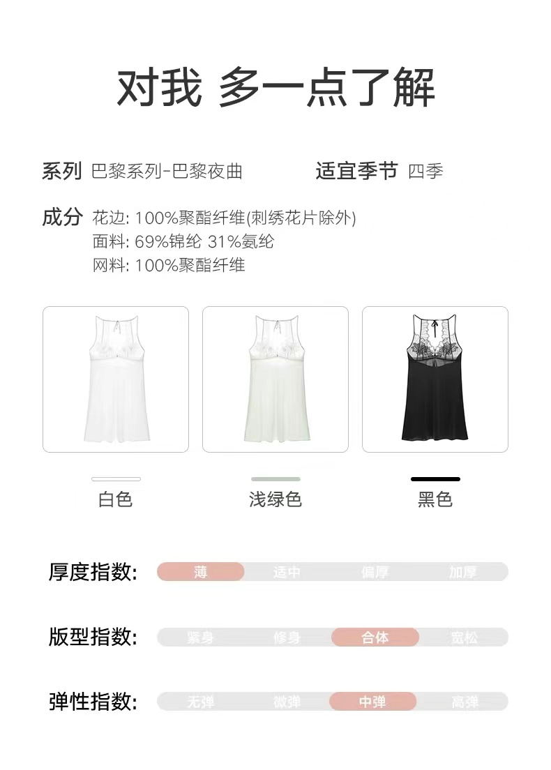 轻薄双弹面料,舒爽不闷,轻盈顺滑,前幅花色蕾丝。灵动群摆