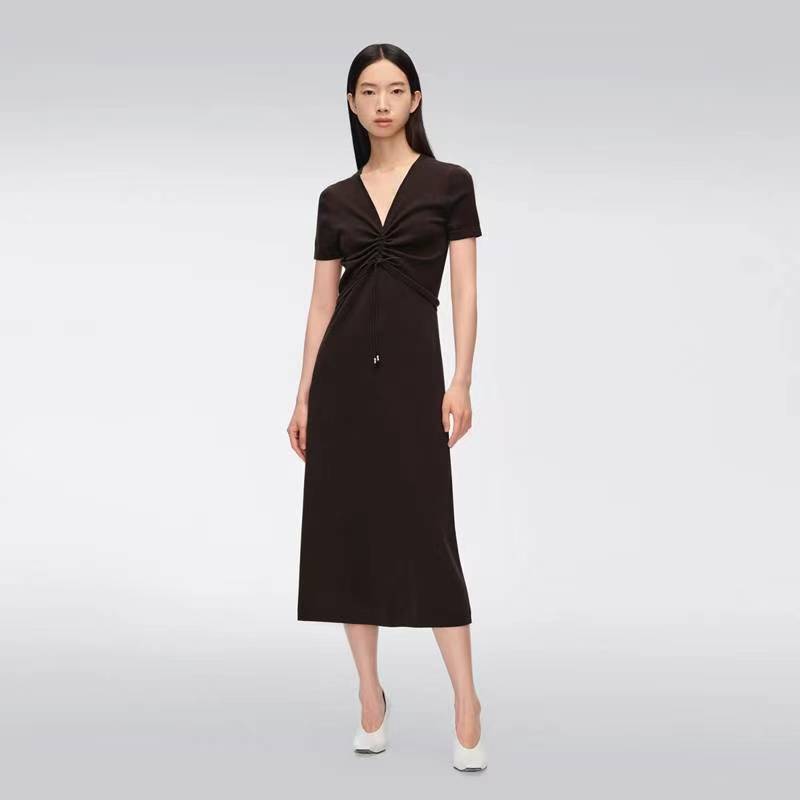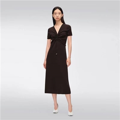 >>OVV丝绵混纺V领短袖中长款A字休闲连衣裙
