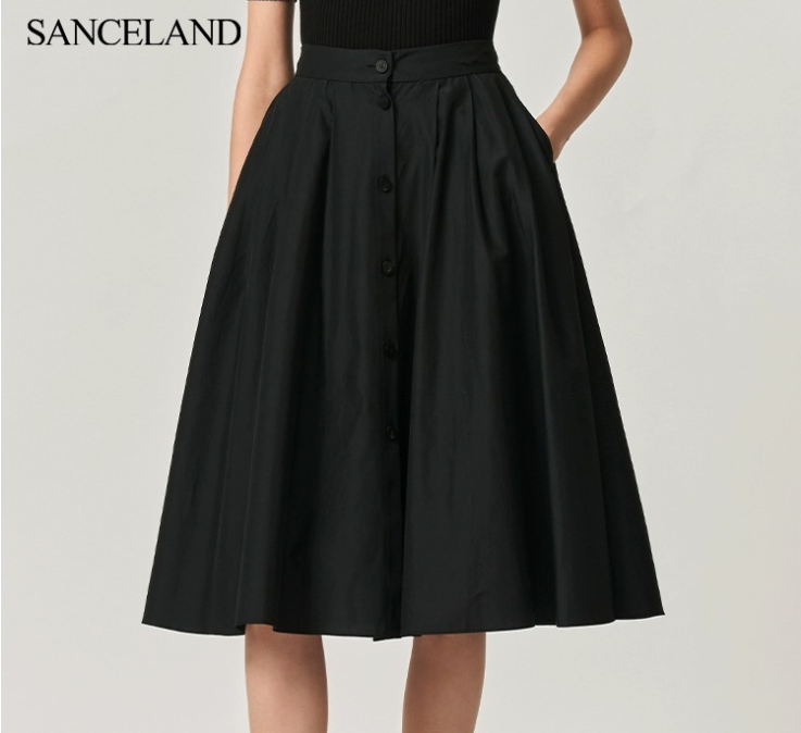 三石一澜2024中长款叠褶伞裙垂坠有型单排纽扣复古