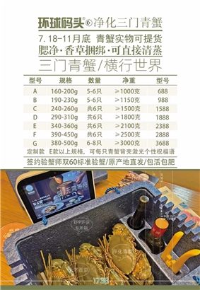 预定先付300元,环球码头净化三门青蟹券全部5折,自由选,补差价