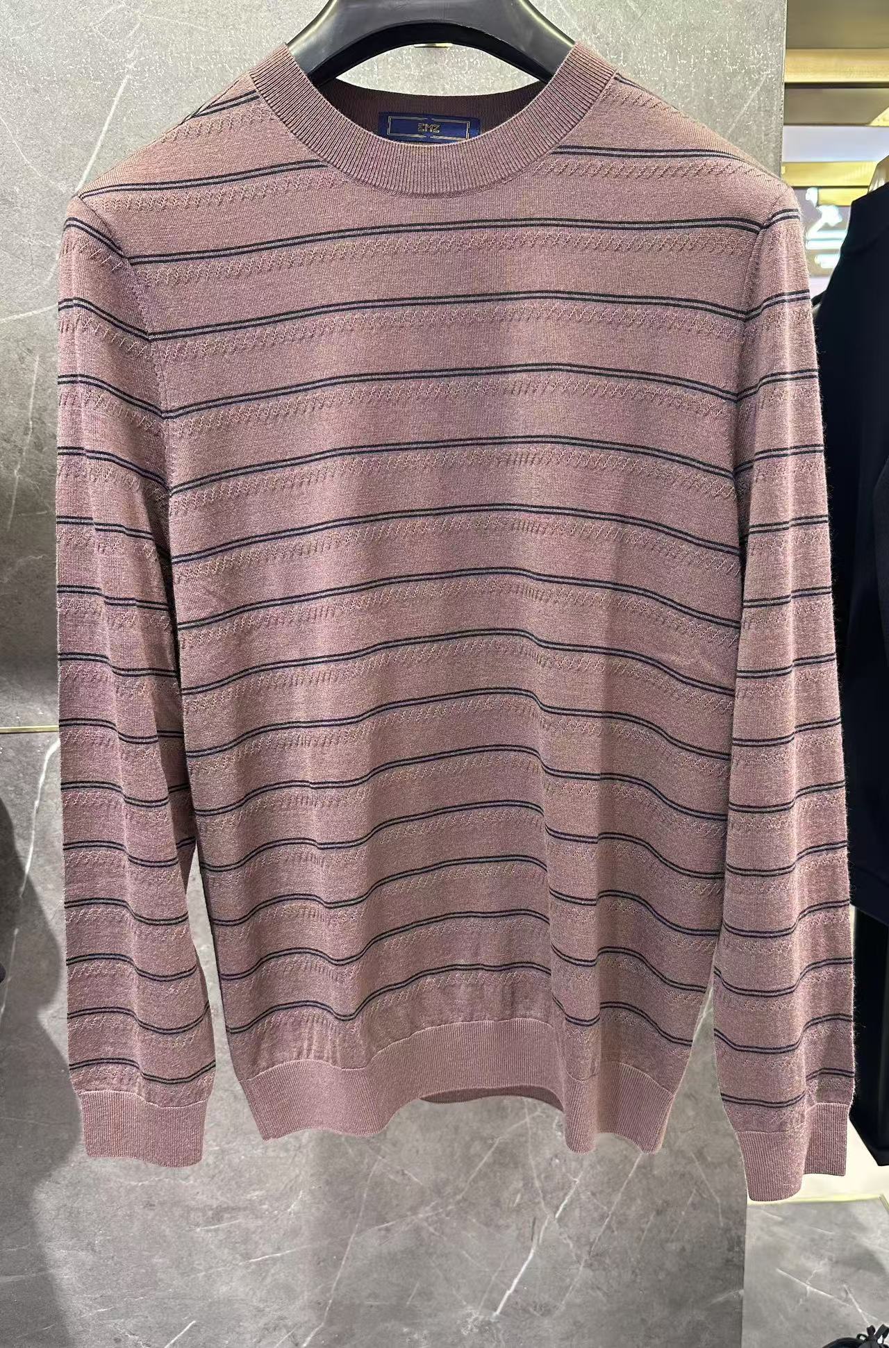 EMZ羊毛衫采用常规领设计,条纹更显年轻时尚,手感非常细腻