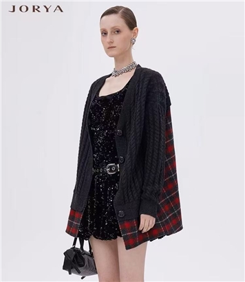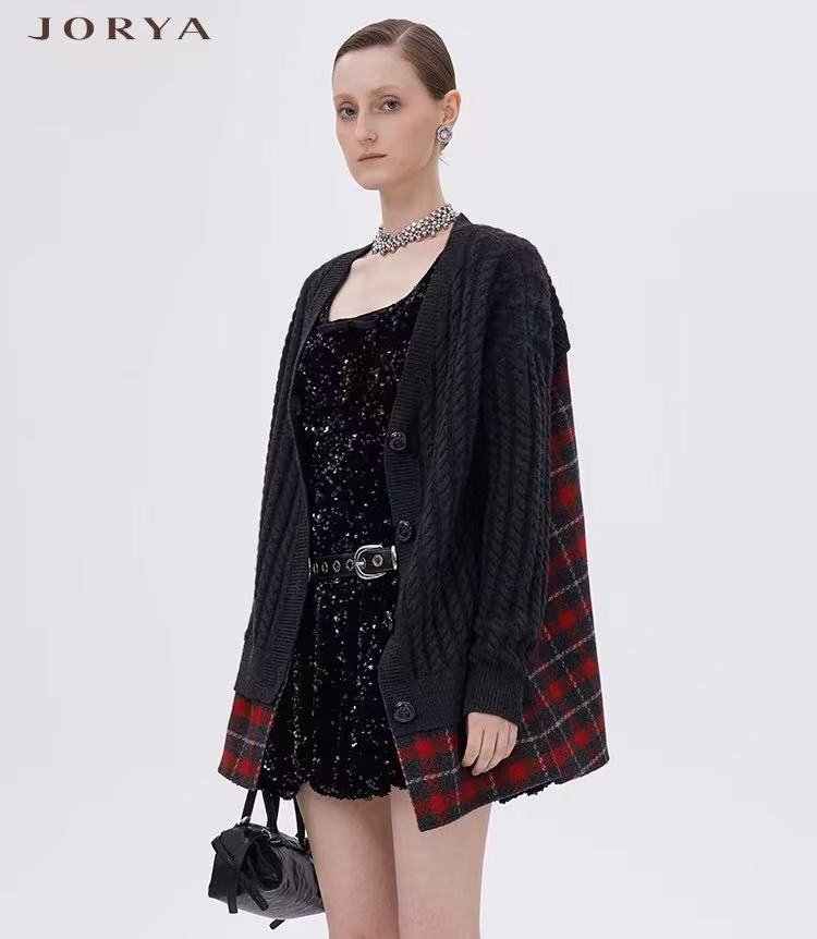 JORYA冬季新款拼接式中长款学院风针织开衫