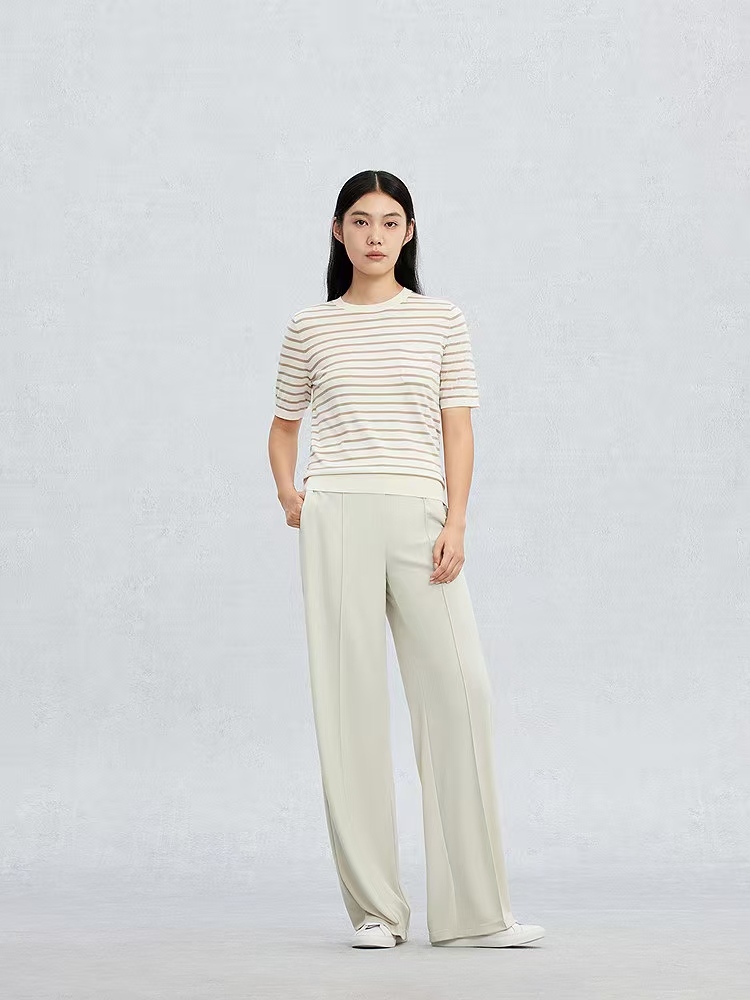>>鄂尔多斯1980精纺圆领夹条半袖女套衫