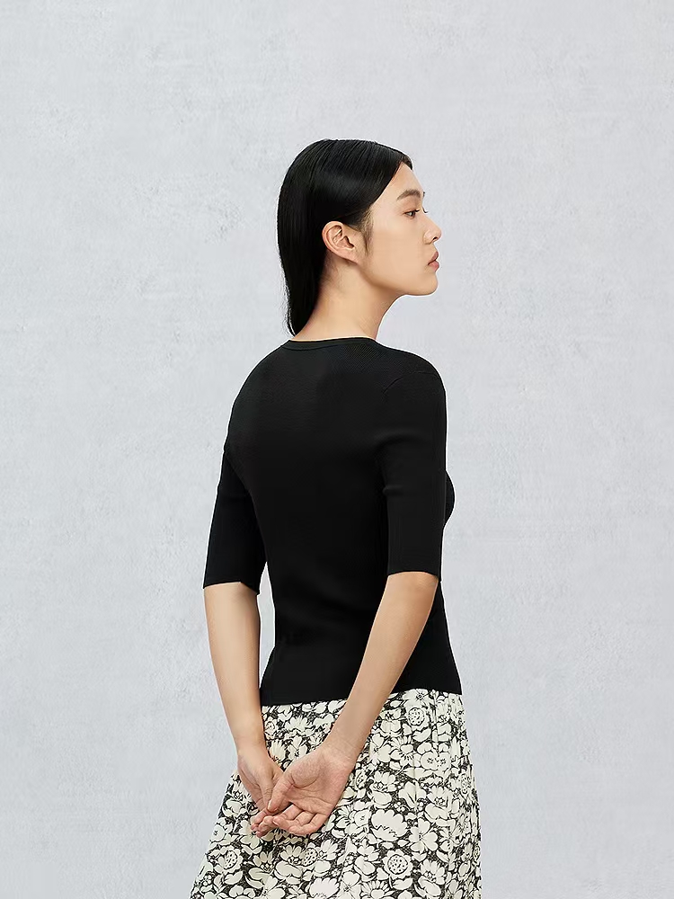 品名:鄂尔多斯1980精纺半袖抽条女套衫 成分:70%棉30%桑蚕丝