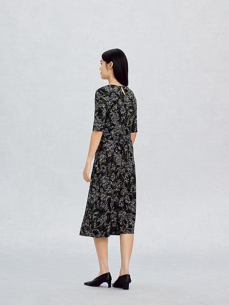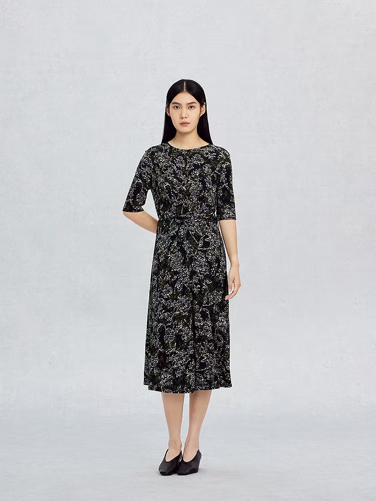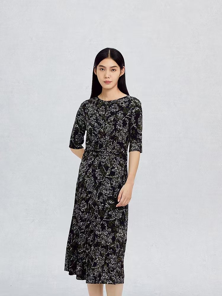 品名:鄂尔多斯1980女弹力印花围裹式连衣裙 成分:100%粘纤