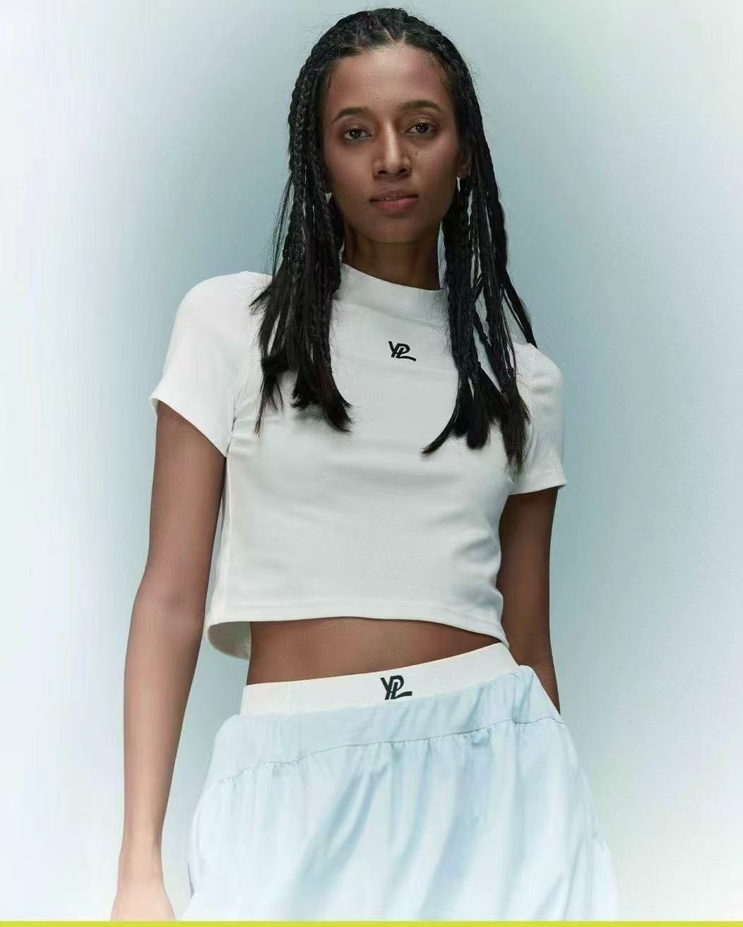 YPL服饰25夏新款女士简约时尚辣妹正肩罗纹短袖T恤