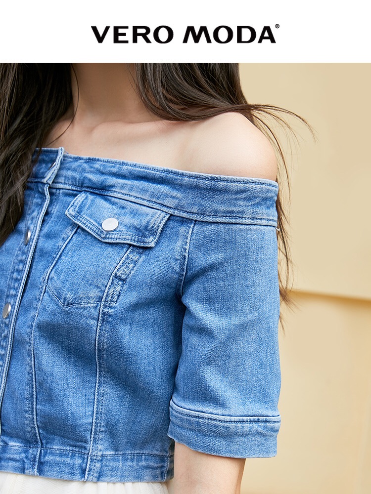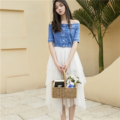 Vero Moda一字领牛仔薄纱拼接蛋糕连衣裙女|319342518