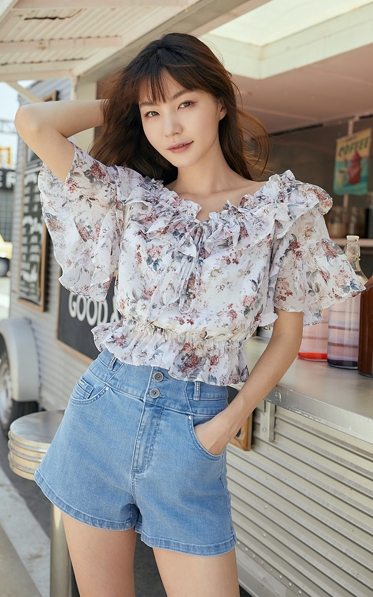 少女装>>VeroModa2020春夏新款ins度假风韩版露锁骨碎花雪纺衫女32026X509