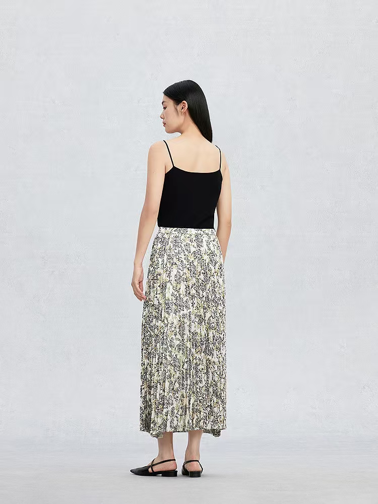 品名:鄂尔多斯1980女印花压褶伞型半裙 成分:面料:95%聚酯纤维5%氨纶 里料:91%桑蚕丝95氨纶