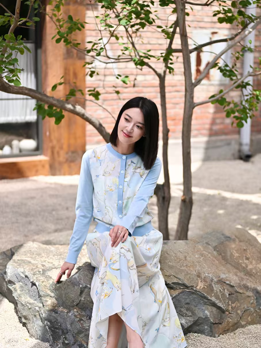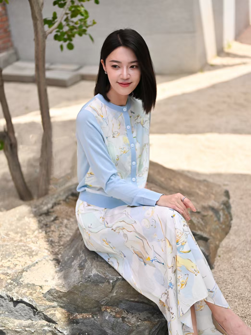 品名:鄂尔多斯1980精纺圆领印花女开衫 成分:针织面料:71%棉29%桑蚕丝 梭织面料:91%桑蚕丝9%氨纶