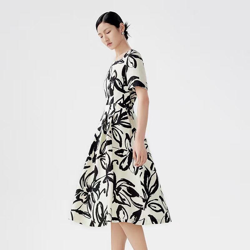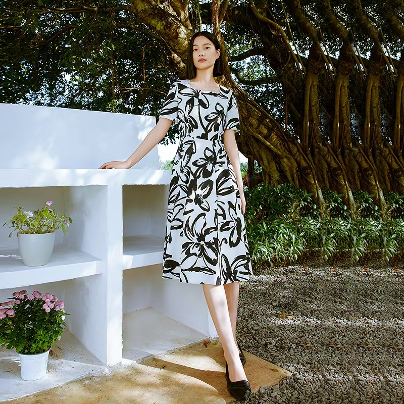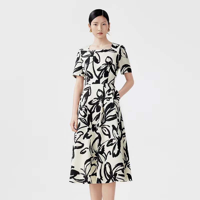 >>朗姿方领短袖印花桑蚕丝宫廷风连衣裙