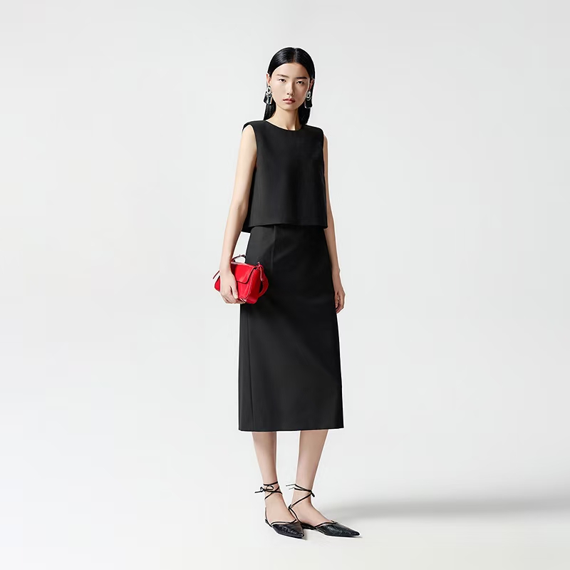 >>朗姿25秋新款气质假两件无袖通勤连衣裙
