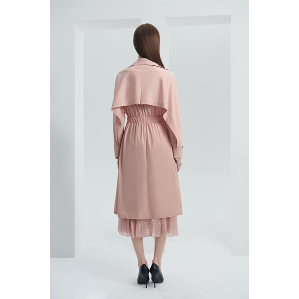款号:LL9T012KWO017 此款风衣,显高雅气质;飘片缝位采用反折工艺,使服装更加平整高级;挡风片延伸至袖子设计,更加时尚;后背抽褶式腰带设计,包容性强,显瘦显年轻;面料双向弹力,手感光滑,穿着舒适。