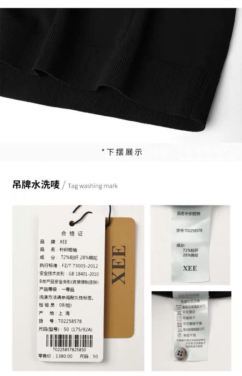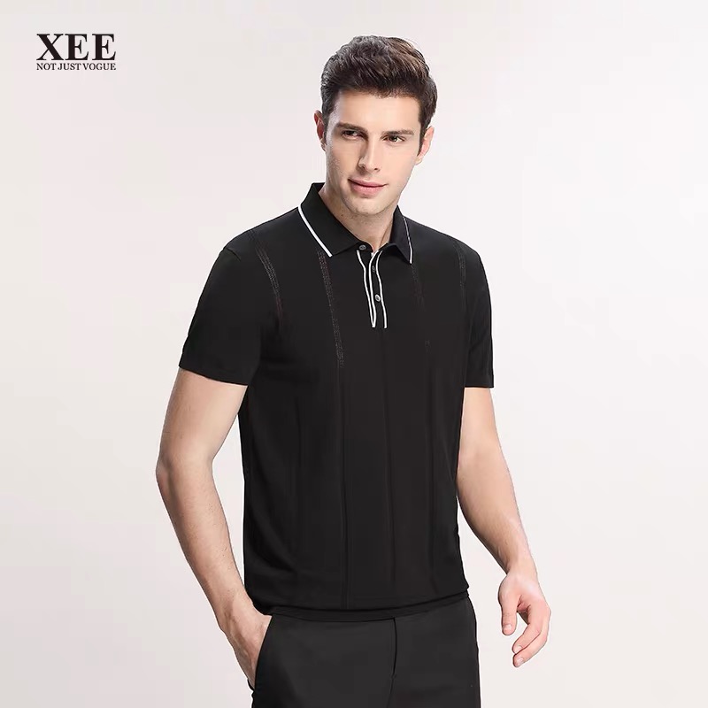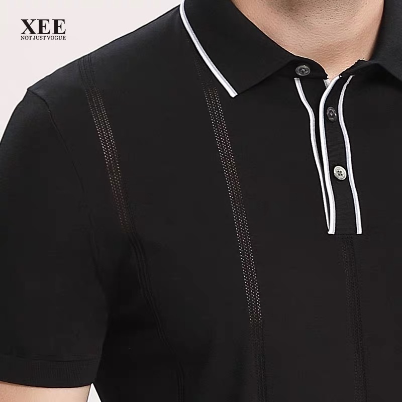 >>XEE商场同款男士黑色撞色领镂空绅士竖条纹翻领POIO衫