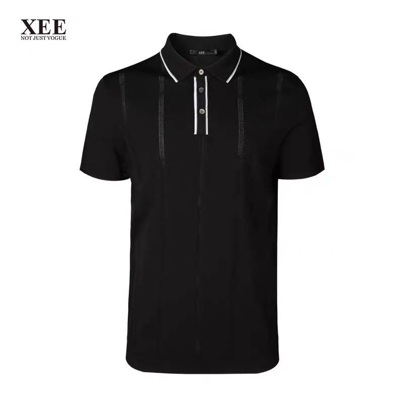 XEE商场同款男士黑色撞色领镂空绅士竖条纹翻领POIO衫