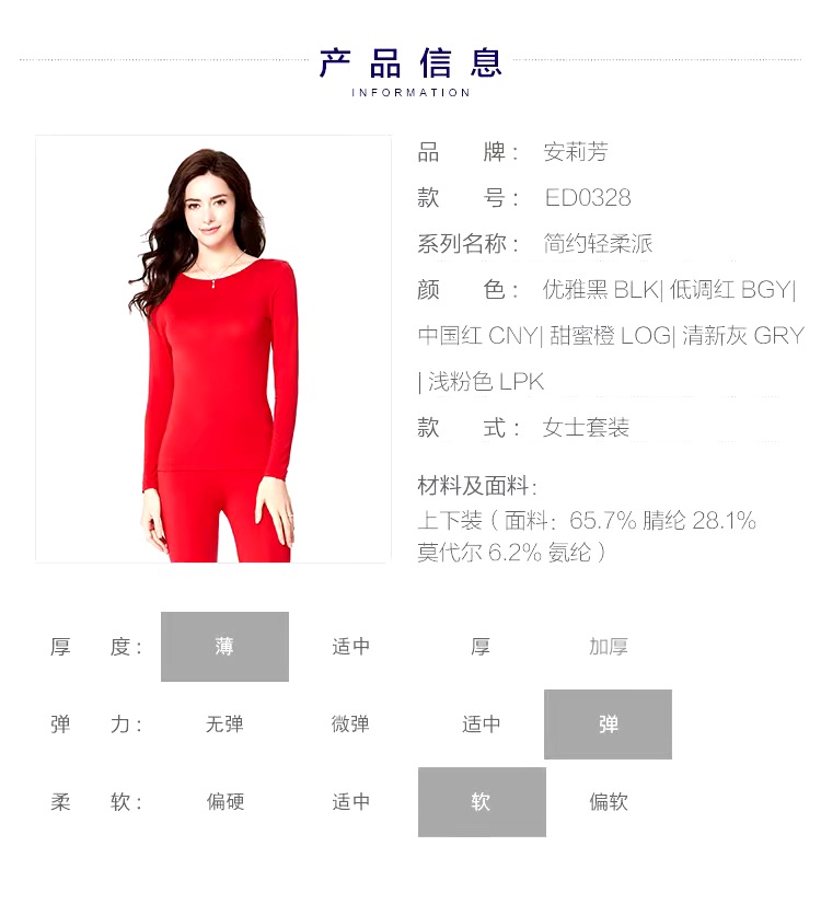 产品名称: 安莉芳/Embryform ED0328 渠道类型: 线上线下同款 材质: 其它 厚薄: 薄款 适用场景: 起居 款号: ED0328 上市时间: 2019年冬季 裤长: 长裤 门襟:  层数:  功能:  是否贴片:  品牌: 安莉芳/Embryform 适用季节: 秋冬