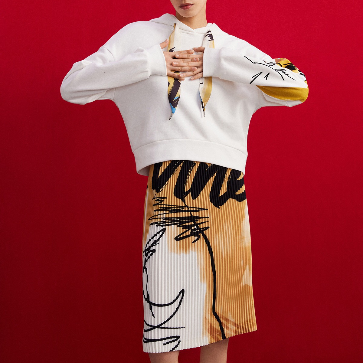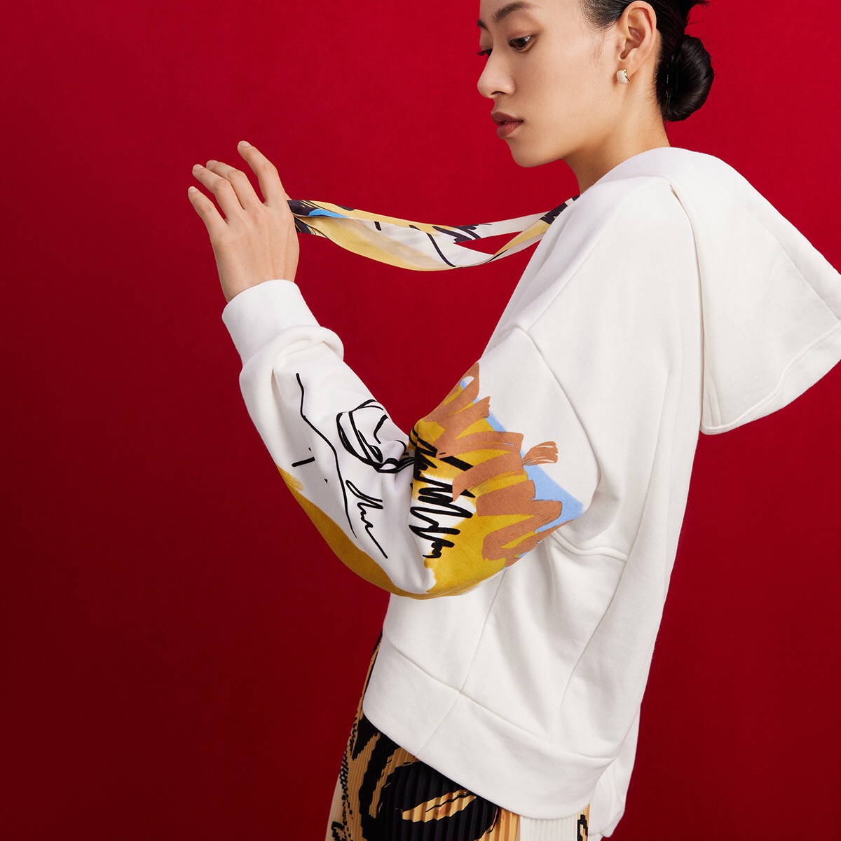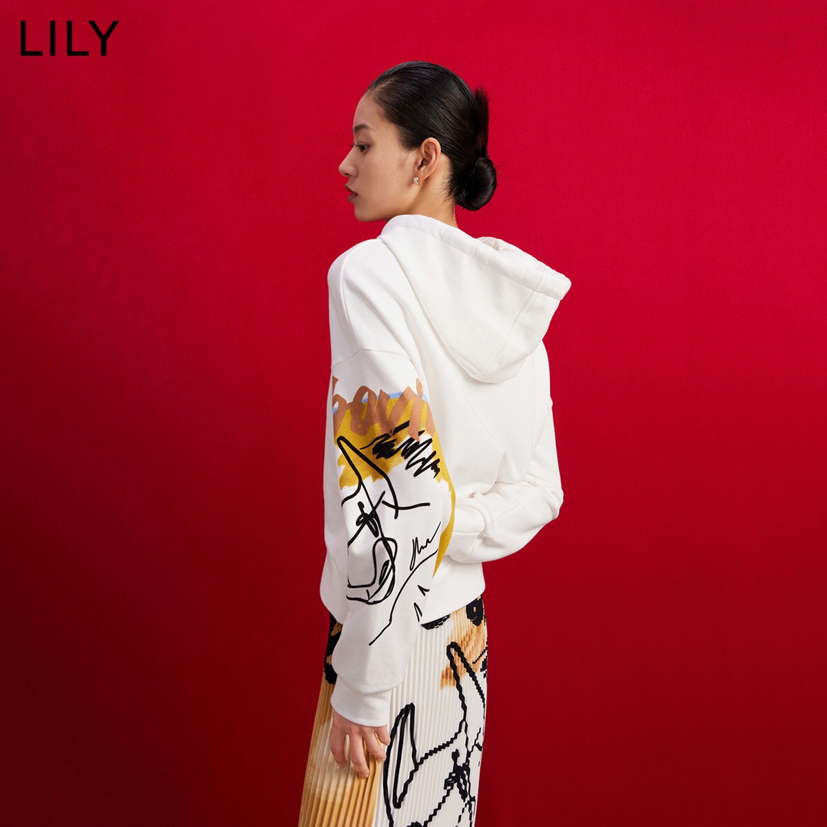 >>LILY2021新款撞色涂鸦不对称印花连帽卫衣