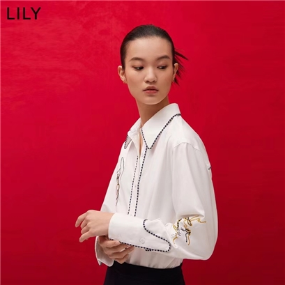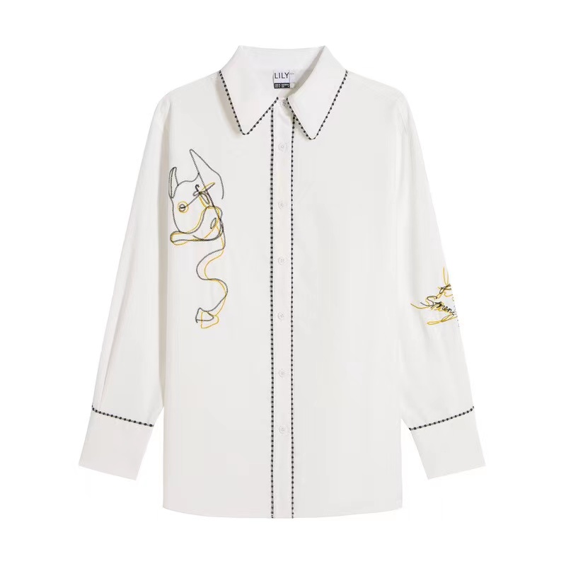 >>LILY2021春装新款艺术感刺绣牛牛直筒长袖白衬衫