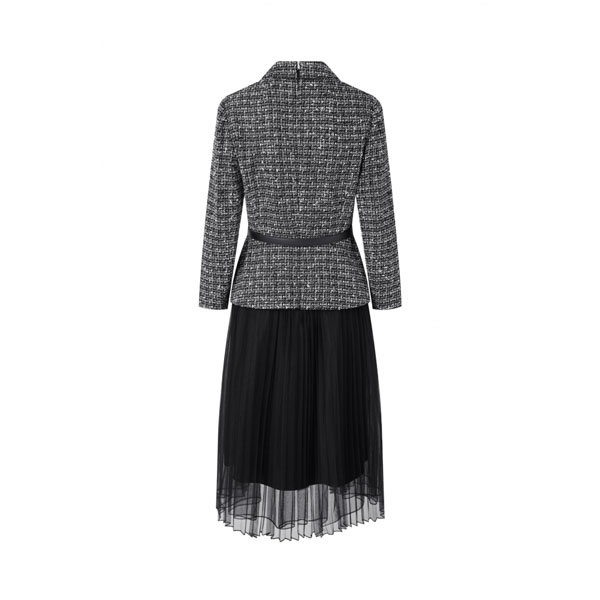 腰部叠片装饰;拼接百褶网纱裙;可拆卸腰带;大气西装领结合X型收腰廓形,简洁利 落,凸显干练职业气场,拼接梦幻百褶网纱,为单品融入优雅女人味,整体风格刚柔并 济,将新时代女性的飒美气质淋漓展现。