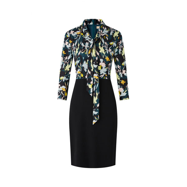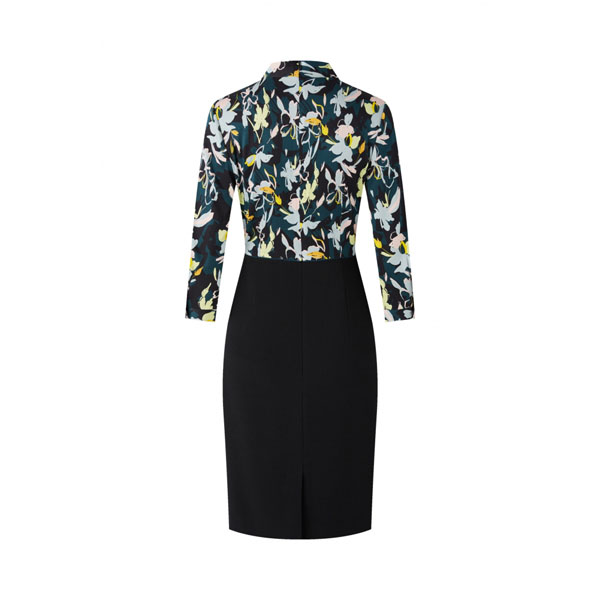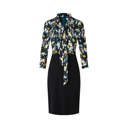 Two-in-one款式;领口系带;3/4袖长;以抽象手绘线条描绘林中花朵的生长形 态, 明快色调在静谧底色上绽放,吐露盎然春意,领口纤长系带增强精致感,彰显自然 柔美的女性气质。