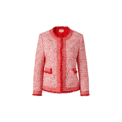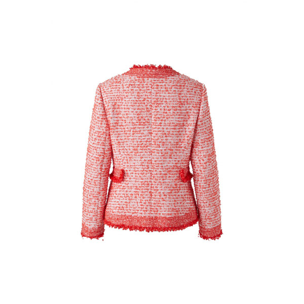 衣边与衣身正反面料拼接装饰;选用法国进口朱瑾红粗花呢面料,热烈朱瑾红完美契 合欢悦年节主题,红白纱线交织,呈现华丽纹理效果,经典直身版型,典雅大方,吉祥喜 悦,优雅大气。