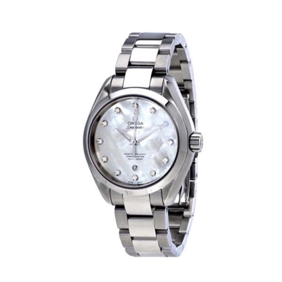 海马系列AQUA TERRA 150米女士腕表搭载全新全球先进机芯,时尚优雅而不失动感活力,专为崇尚积极生活方式的人是亲情打造,此表款配备珍珠贝母表盘,是有12枚钻石小时刻度。 这款海马系列AQUA TERRA 150米女士腕表搭载同材质表链腕表,内部搭载具有革命性的欧米茄8520至臻同轴机芯,可抵抗高达一万五高斯的强磁场。