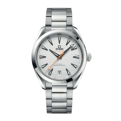 海马系列Aqua terra腕表颂扬欧米茄辉煌的海洋传奇,这款41毫米腕表的对称表壳以精钢打造而成,表背采用波纹边缘设计。水平“柚木”纹理令银色表盘尽显与众不同,设计灵感源自豪华游艇上的又木甲板。 6点钟位置亦设有日历窗口指针和小时刻度经过黑化处理,覆以白色Super-LumiNova夜光涂层。中央秒针涂覆橙色分钟,分钟圈上"Seamaster"字样和四个刻度数字也均由橙色呈现,腕表搭配抛光磨砂表链。