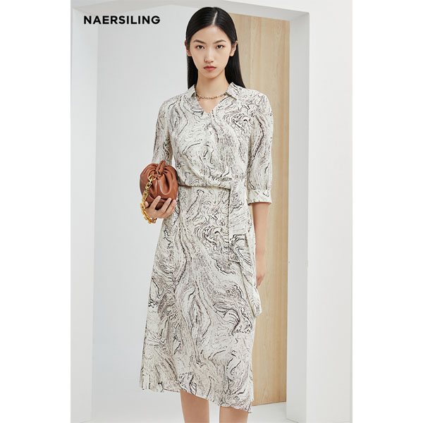 这款大理石纹印花连衣裙,灵感源于奇妙的大自然,将地貌原石矿物质中不规则的具有天然纹理的图案融入在服装设计当中,呼应了可持续发展的主题,同时让人们更加贴近自然;腰部采用打结设计,灵感多变可随心调节,修饰腰部线条的同时收腰显瘦,凸显女性的优美身形;采用真丝双邹面料,吸湿透气性能好,并能有效防紫外线,达到护肤保健的运用,可日常穿着,彰显您轻松,舒适的一面。