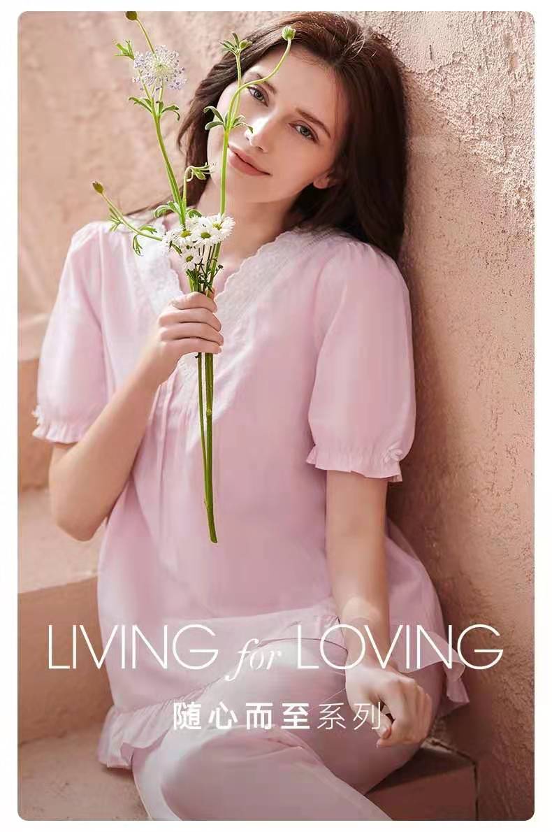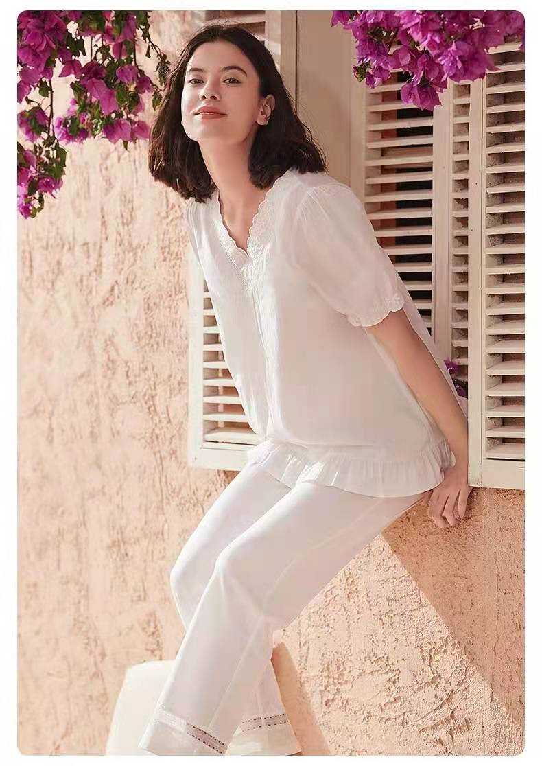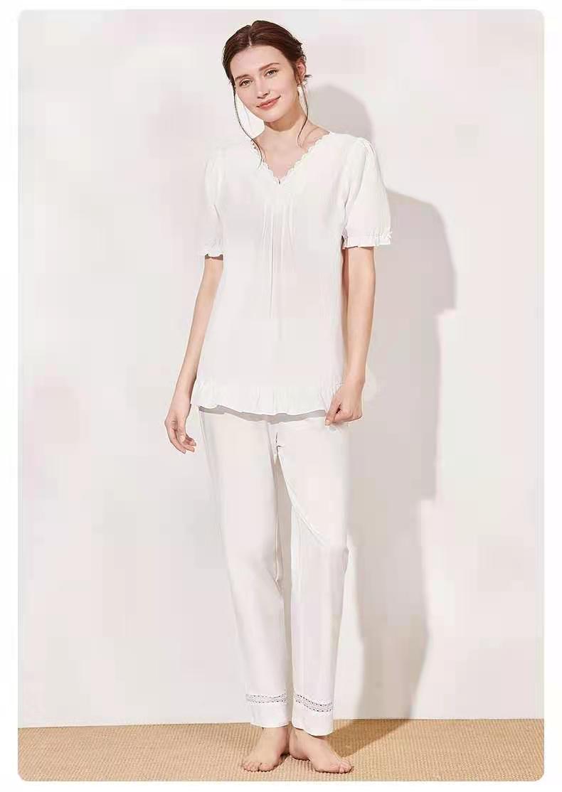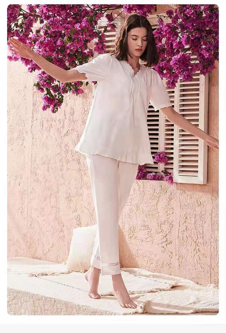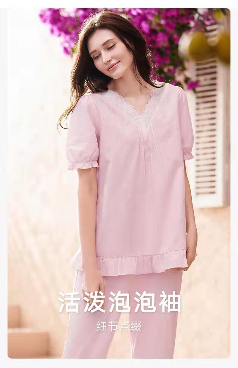 曼妮芬V领泡泡短袖长裤套装 简约长绒棉舒适透气家居装睡衣起居服