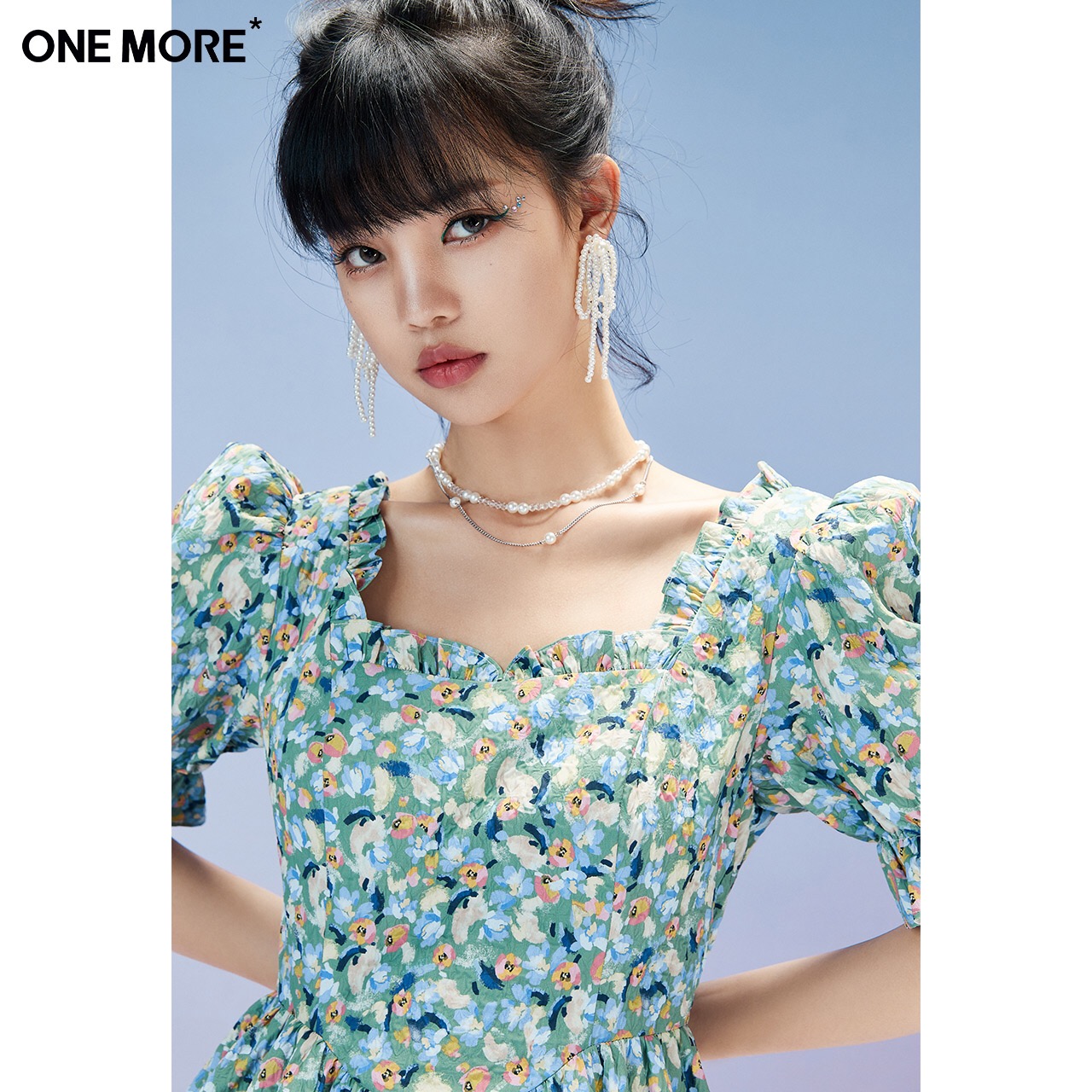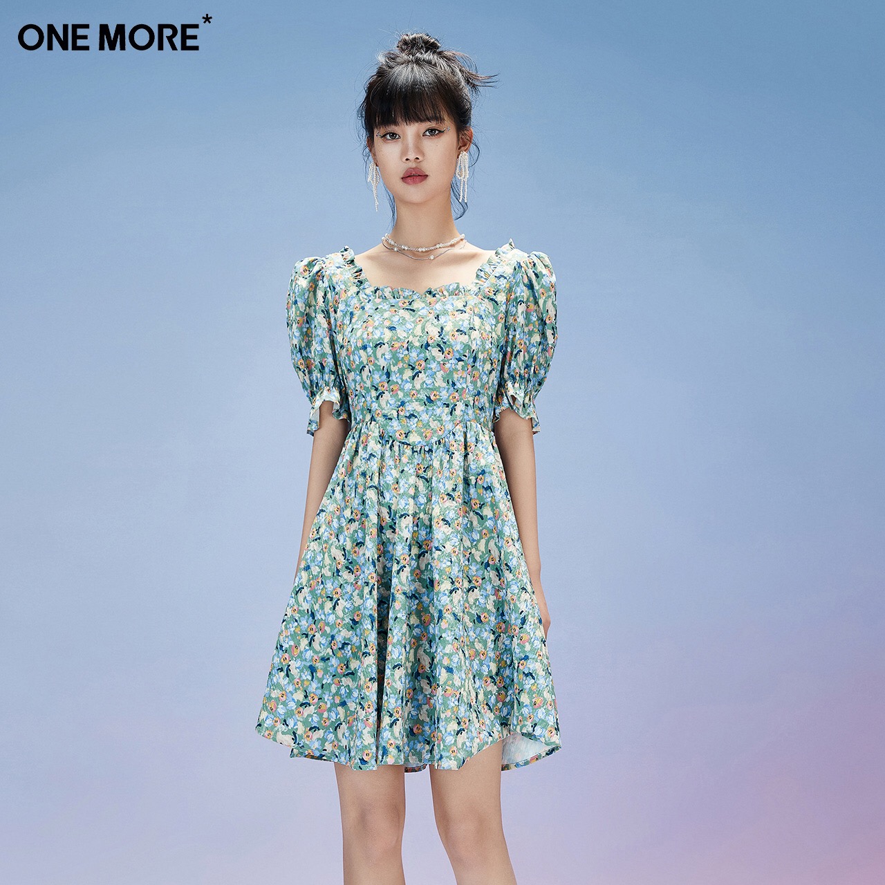 one more夏季新款碎花泡泡袖连衣裙